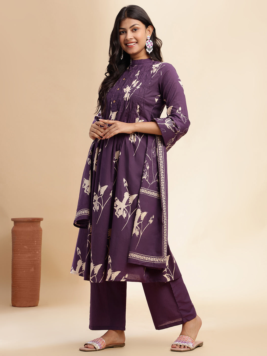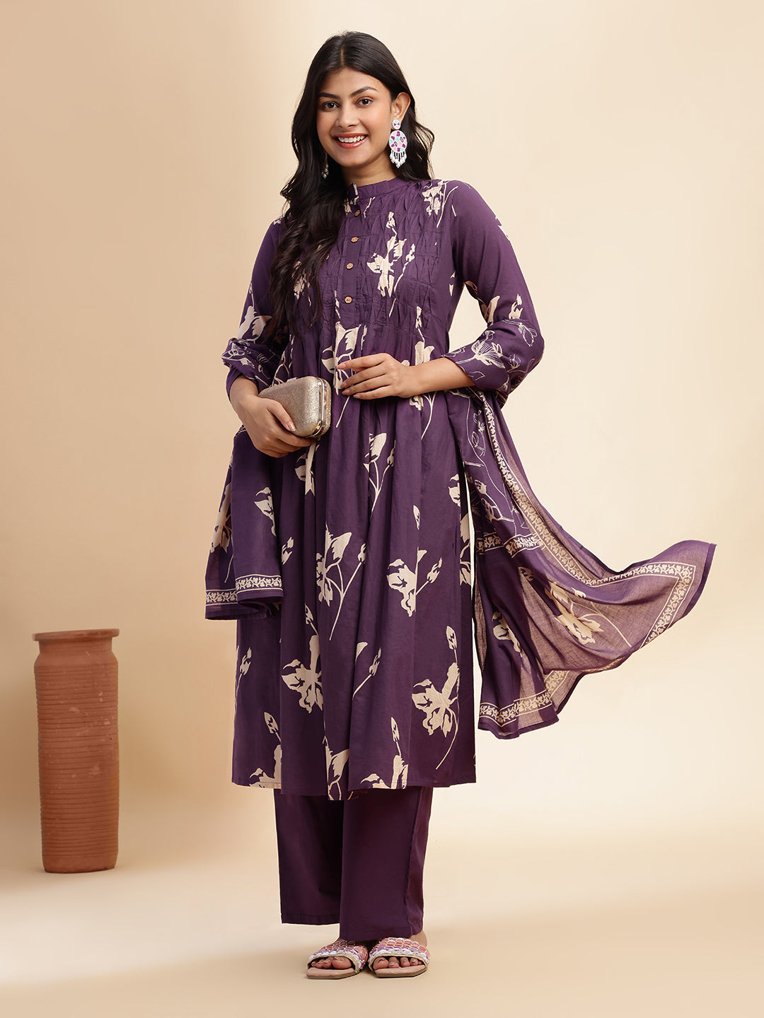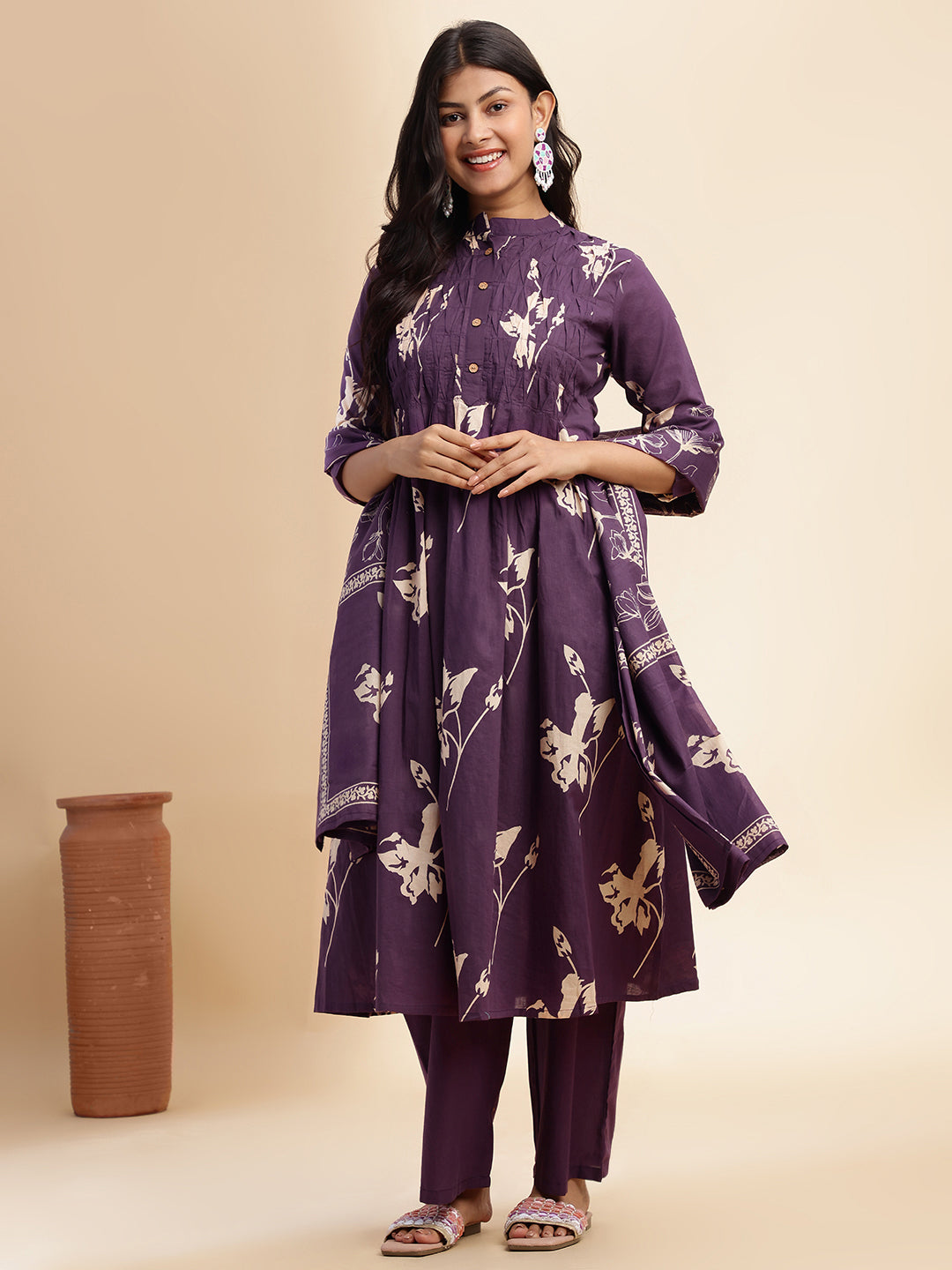 Wine Floral Print A-line Cotton Stitched Kurta Set