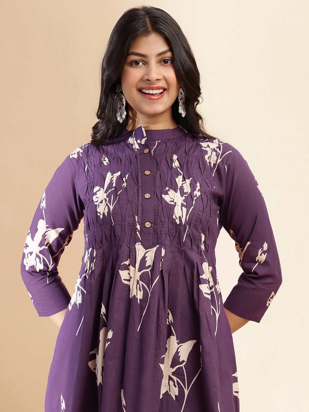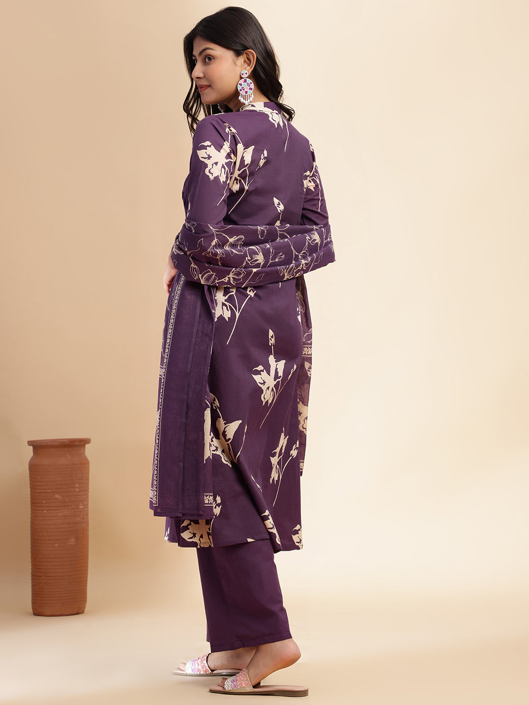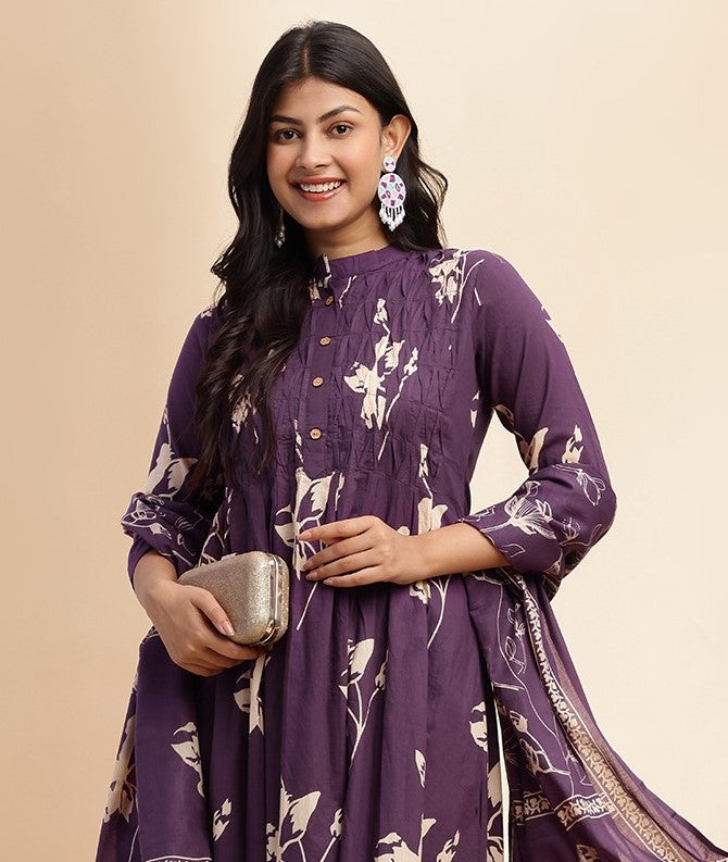 Wine Floral Print A-line Cotton Stitched Kurta Set
