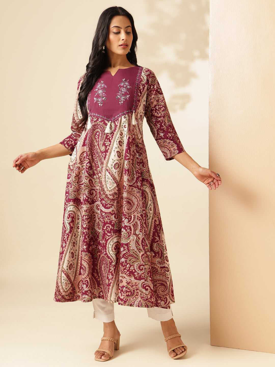 Effortlessly stylish, this Wine Paisley Printed Anarkali Cotton Kurta will make you stand out from the crowd. The rich wine color and intricate paisley print add a touch of elegance, while the anarkali style and cotton fabric provide ultimate comfort. Perfect for any occasion. Cheers!