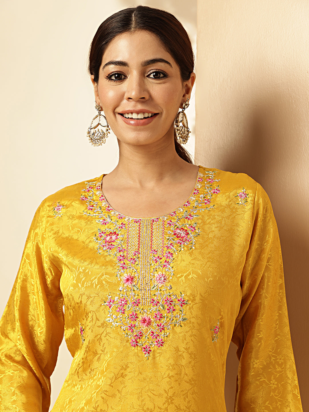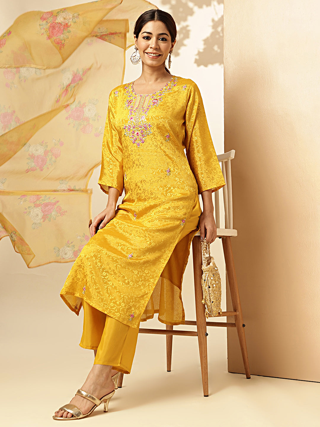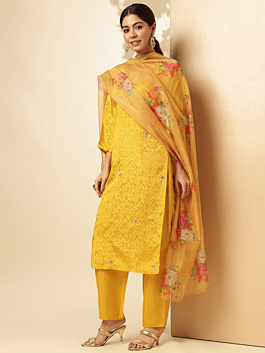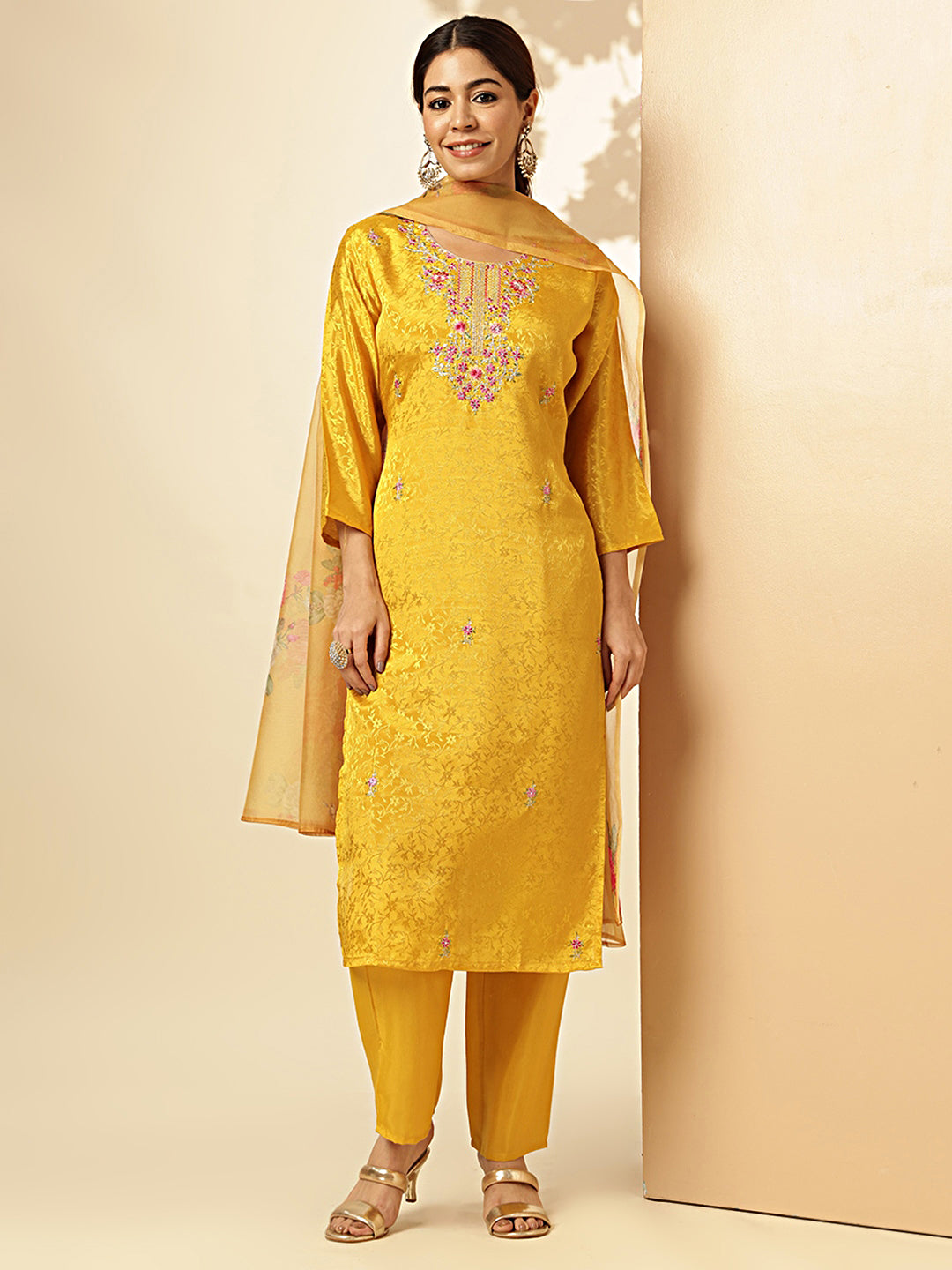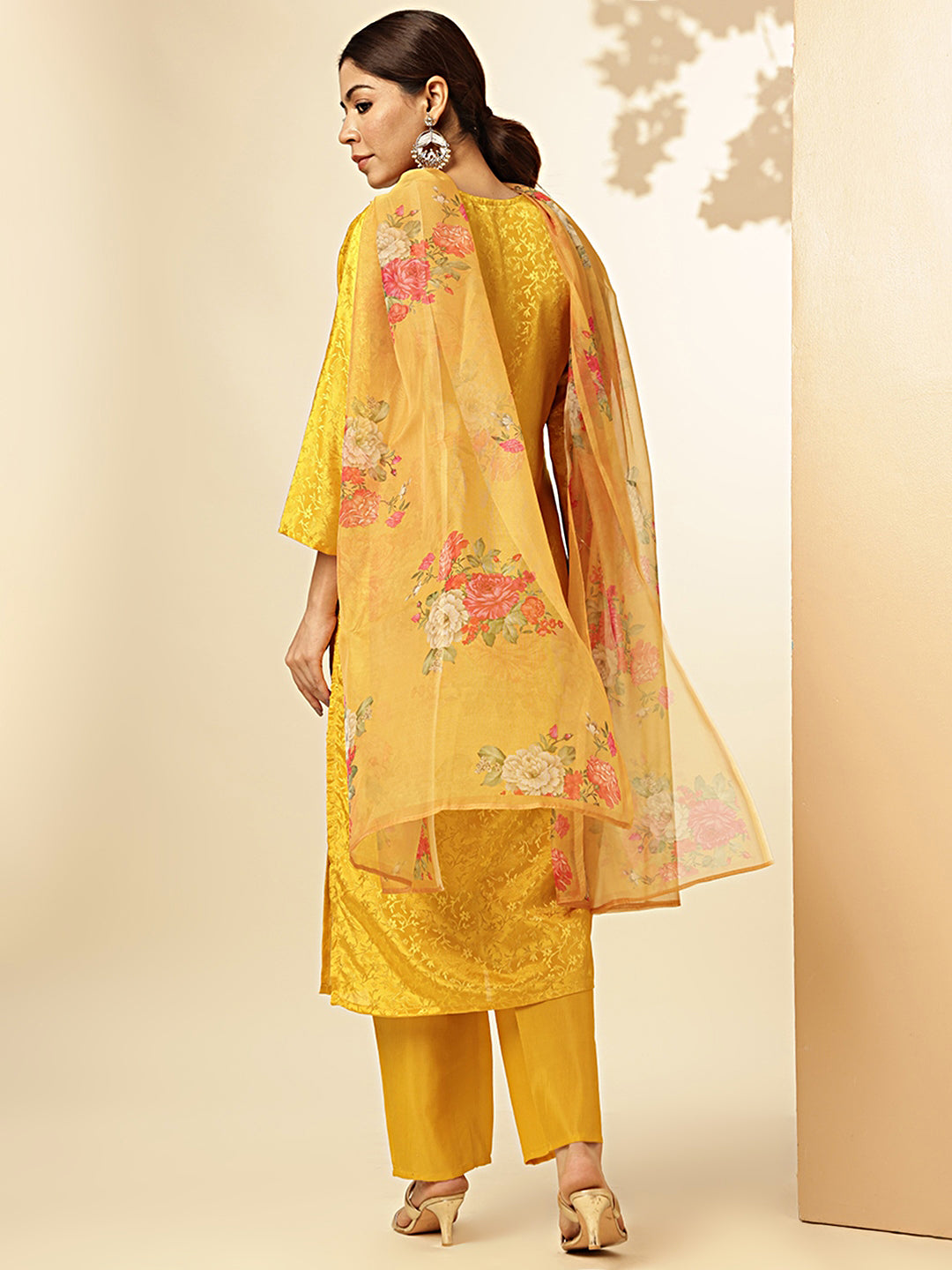 Mustard Woven Work Straight Chiffon Jacquard Stitched Kurta Set