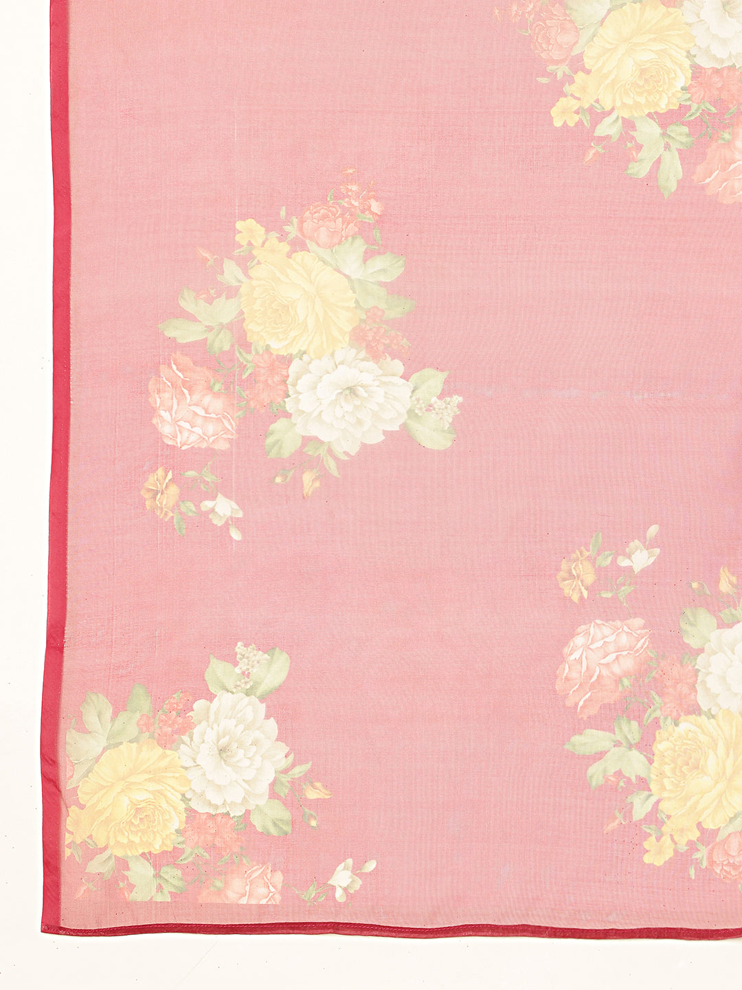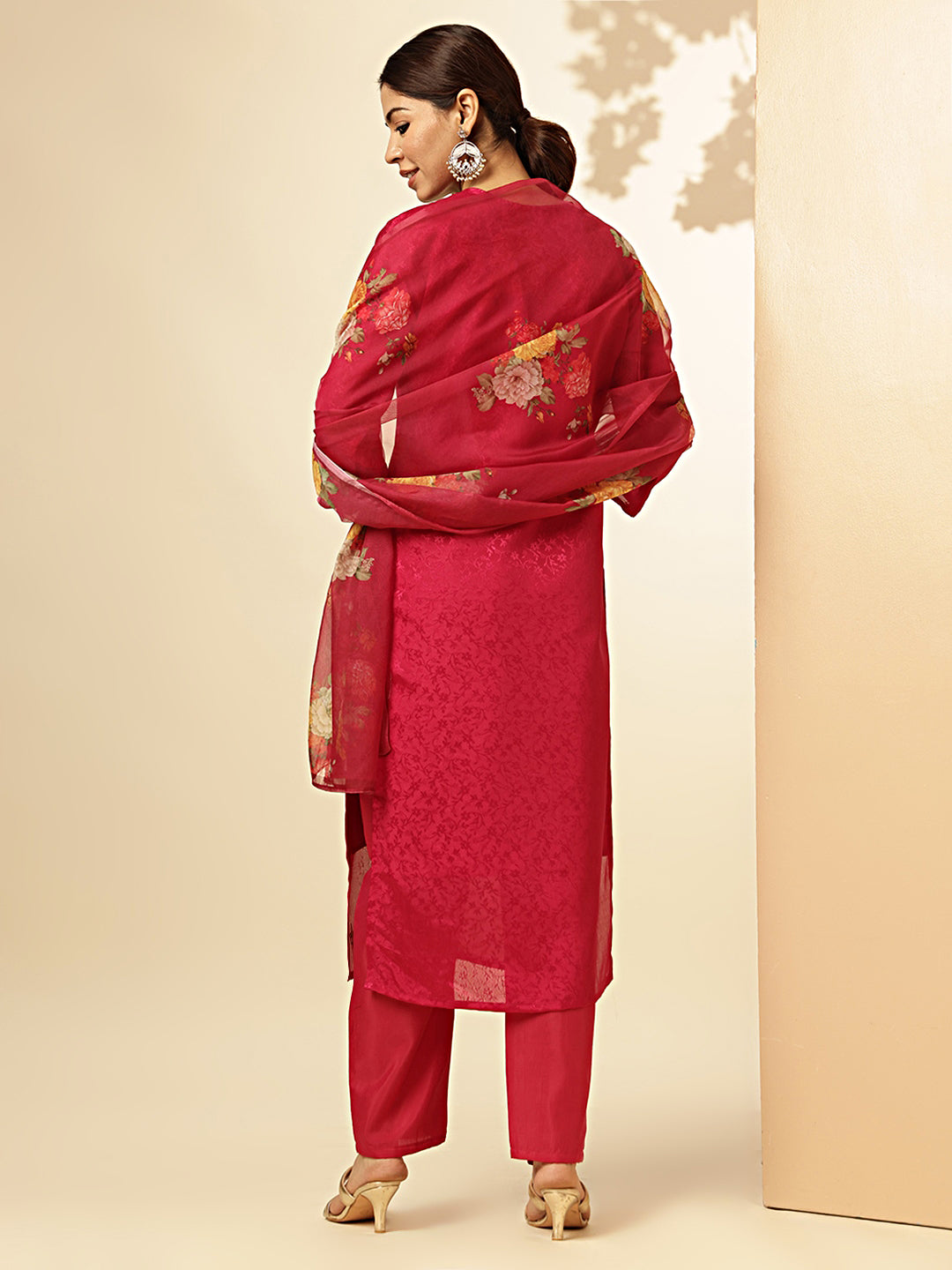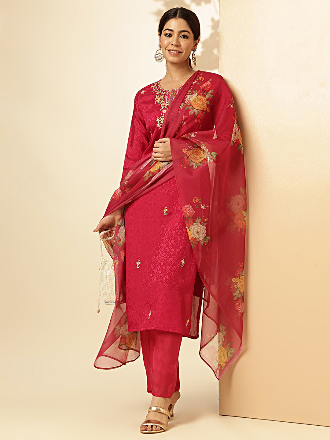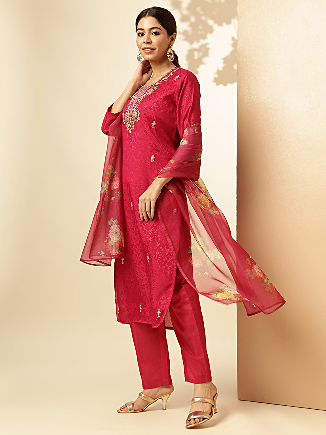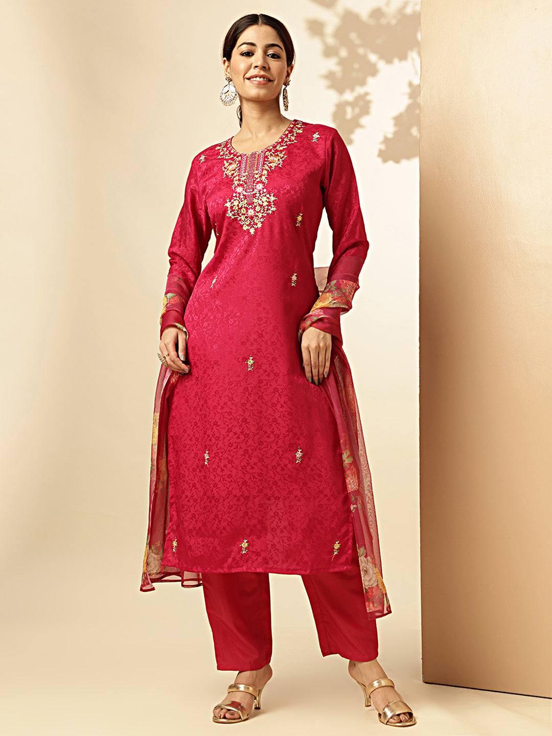 Pink Woven Work Straight Chiffon Jacquard Stitched Kurta Set