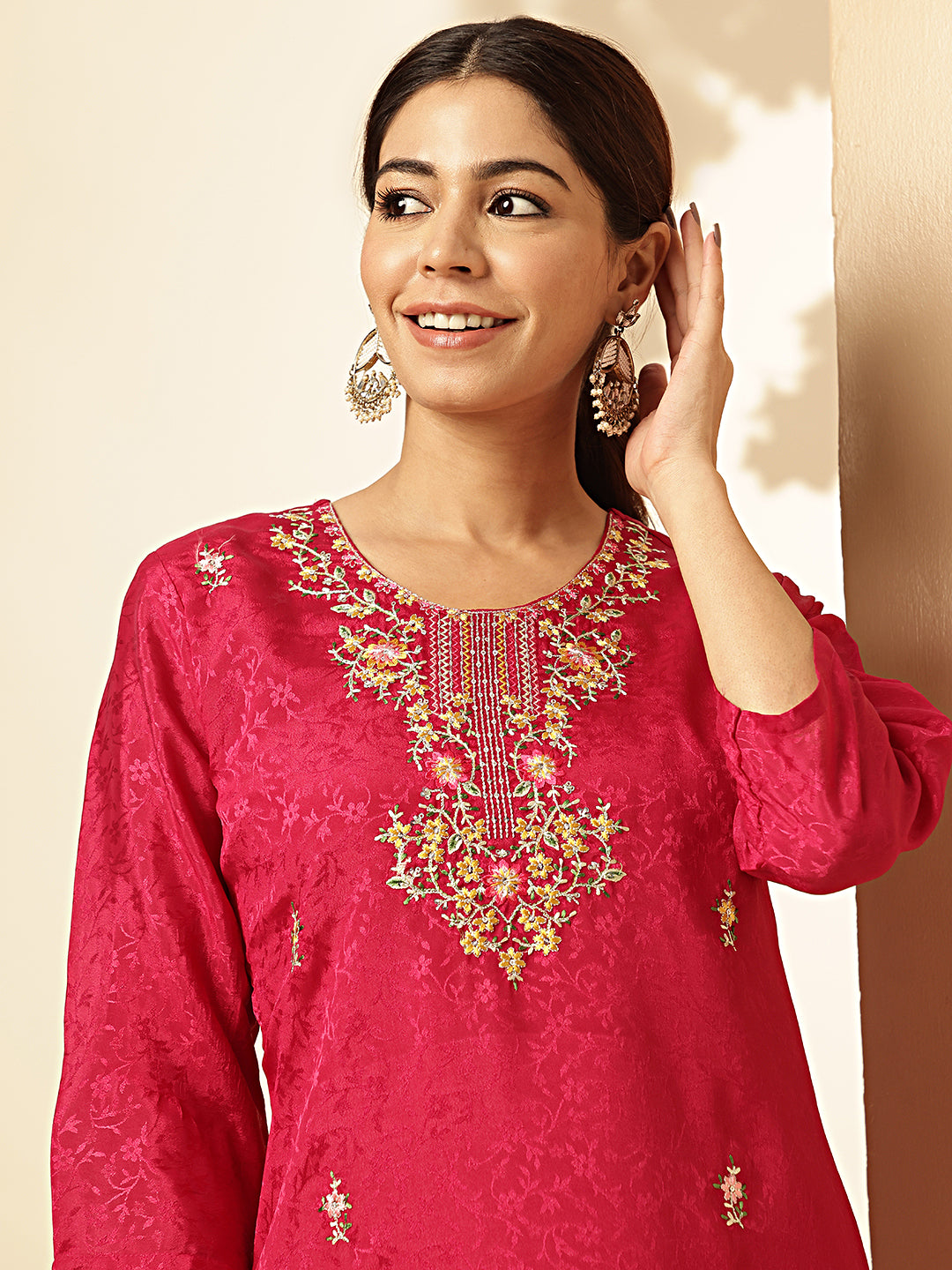 Add some color and style to your wardrobe with this Pink Woven Work Kurta Set. Made of high-quality chiffon jacquard, it features a straight fit and intricate woven detailing. Perfect for work or a night out, this kurta set will make you stand out in any crowd.