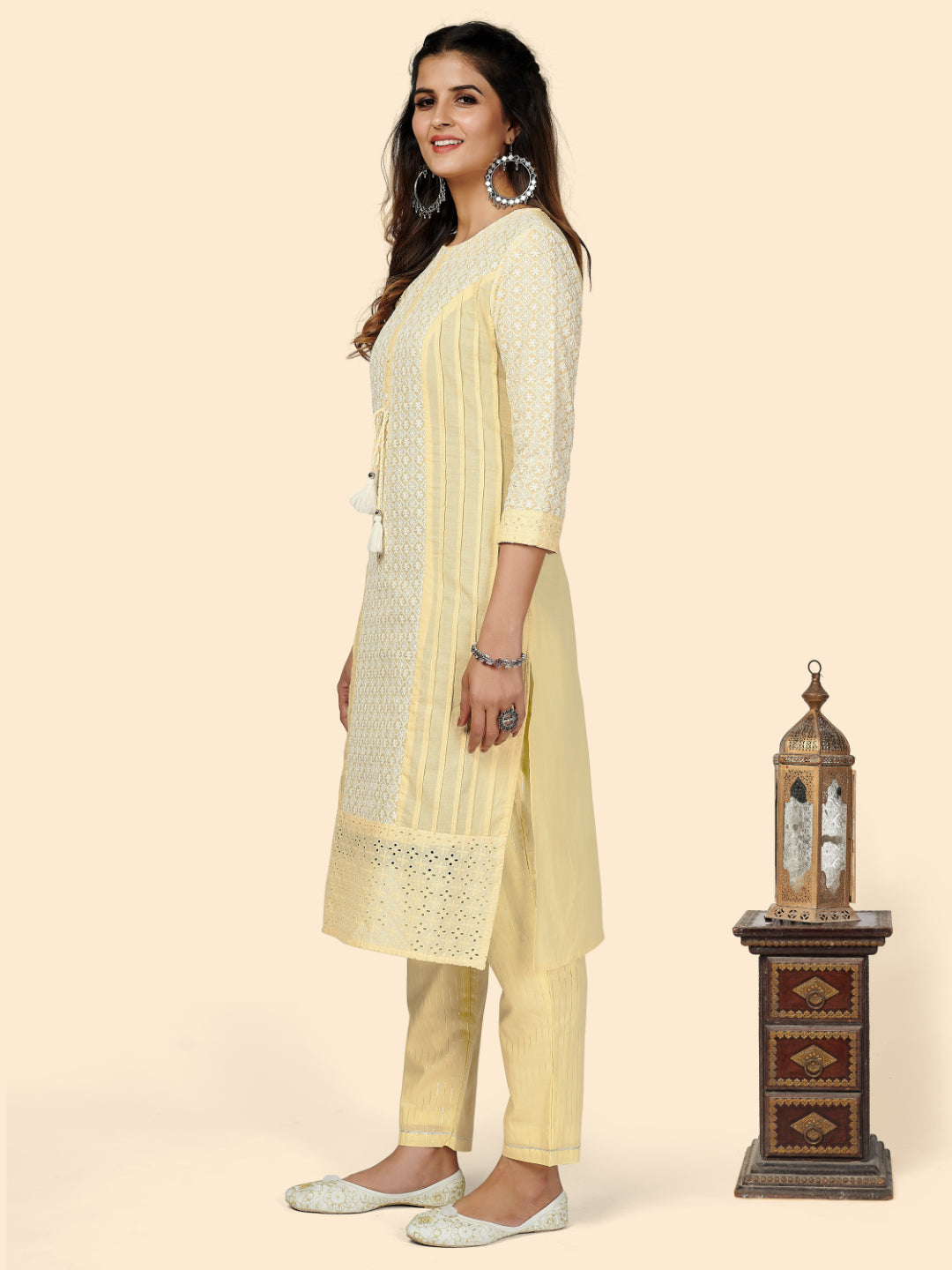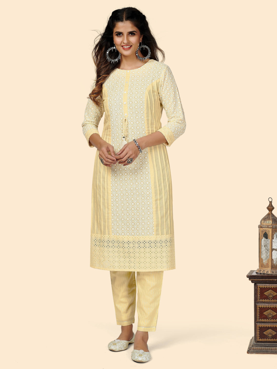 This Yellow Chikankari Straight Cotton Kurta Pant is the perfect choice for casual or office wear. Tailored from a lightweight cotton fabric, this sophisticated piece is designed with a stunning yellow colourway, and features intricate chikankari embroidery throughout. An elegant wardrobe essential, it is sure to make a chic statement.