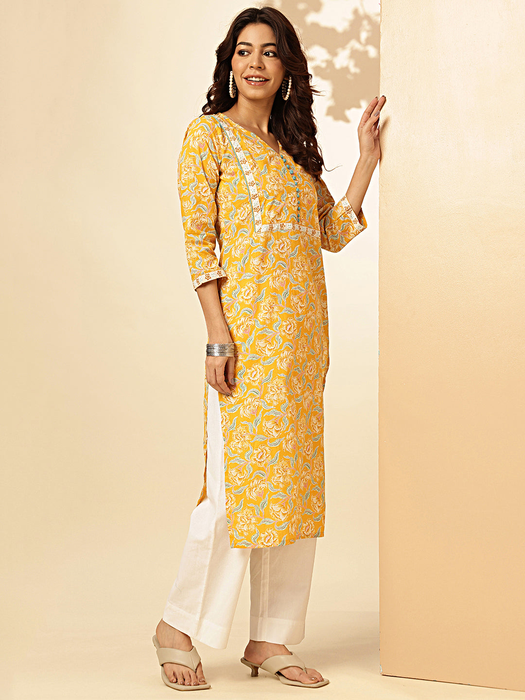 Yellow Floral Print Straight Cotton Stitched Kurta