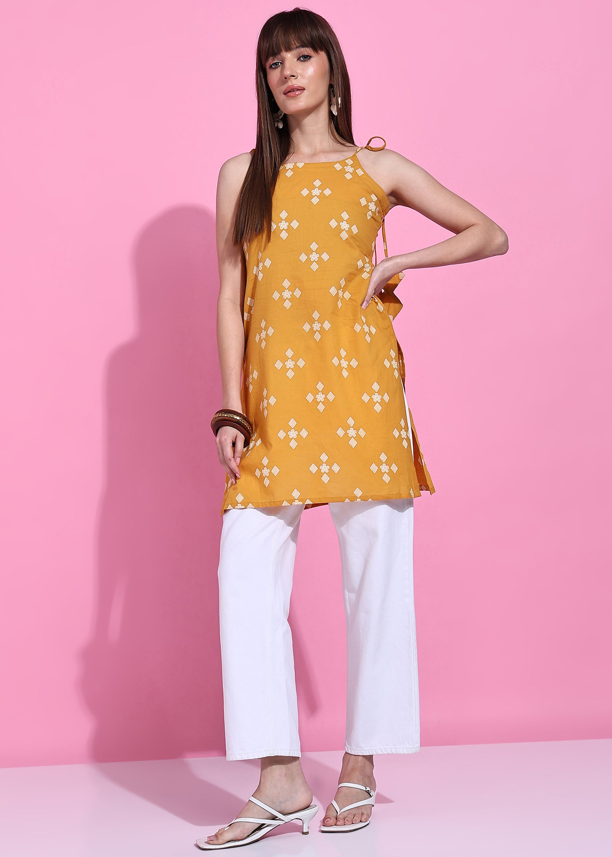 Elevate your casual wardrobe with this striking yellow geometric kurta, meticulously crafted from premium cotton. The straight silhouette offers a flattering, comfortable fit perfect for everyday wear, while the geometric pattern adds contemporary visual interest. Hand-stitched construction ensures durability and refined finishing touches. Ideal for pairing with traditional bottoms or modern trousers, this versatile piece transitions seamlessly from casual outings to relaxed gatherings. The breathable cotton fabric keeps you cool and comfortable throughout the day, making it an essential addition to your ethnic wear collection.